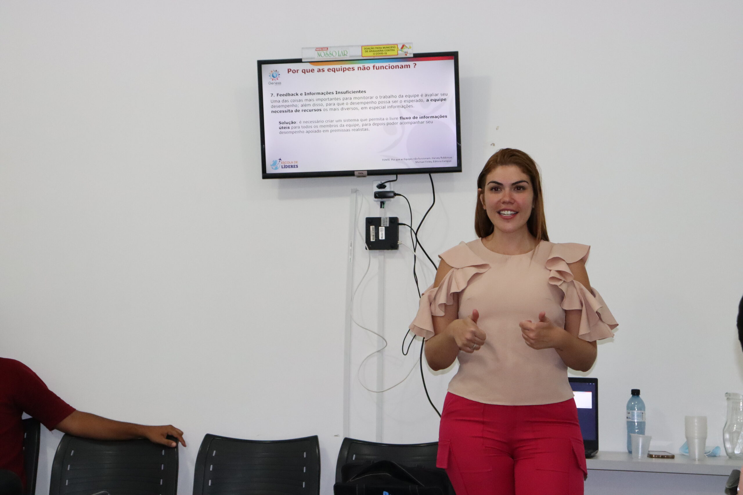 No treinamento, Ruama conversou com os líderes sobre a importância de dar um feedback adequado para os colaboradores liderados, trazendo os pontos positivos e conversando com eles sobre o que podem melhorar.